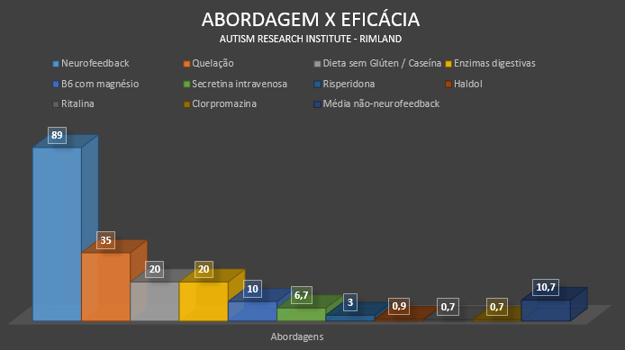 As principais descobertas deste estudo incluem uma taxa de sucesso de 89%, com uma redução de 40% nos sintomas fundamentais das DEA, como resultado do treinamento e avaliação guiada por neurofeedback ao longo de 20 sessões. Uma melhoria significativa foi observada para o grupo experimental em medidas de atenção e funções executivas, de percepção visual e de linguagem. Imagens por infravermelho confirmaram uma atividade metabólica elevada, mesmo dentro das sessões iniciais. Uma mudança duradoura foi indicada por uma atividade metabólica melhorada, pela estabilidade de resultados e pela manutenção de mudanças antes e depois da vigésima sessão do tratamento. A razão entre os benefícios e os efeitos negativos foi de 89:1 (figura acima), superando todos os demais tratamentos para DEA, de acordo com a pesquisa de Rimland (2005). Setenta e seis por cento do grupo experimental tiveram uma diminuição nos padrões de hiperconectividade. A hiperconectividade reduzida, bem como mudanças duradouras na atividade metabólica confirmaram a alteração neurofisiológica seguinte ao tratamento por neurofeedback.