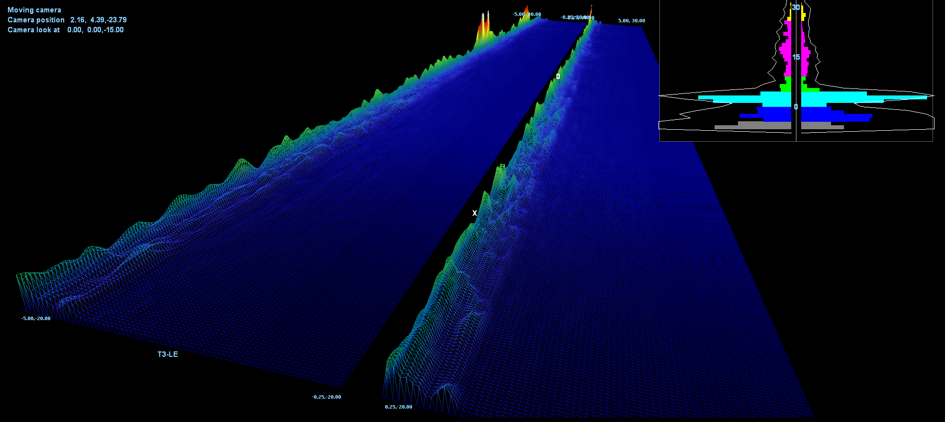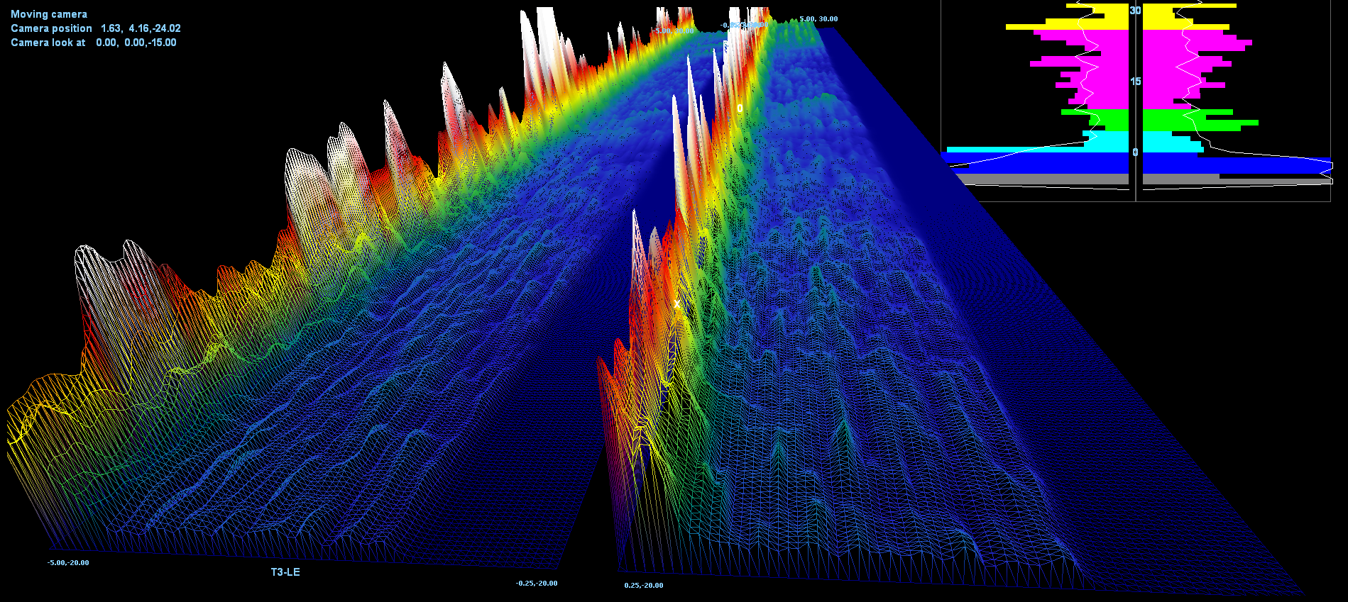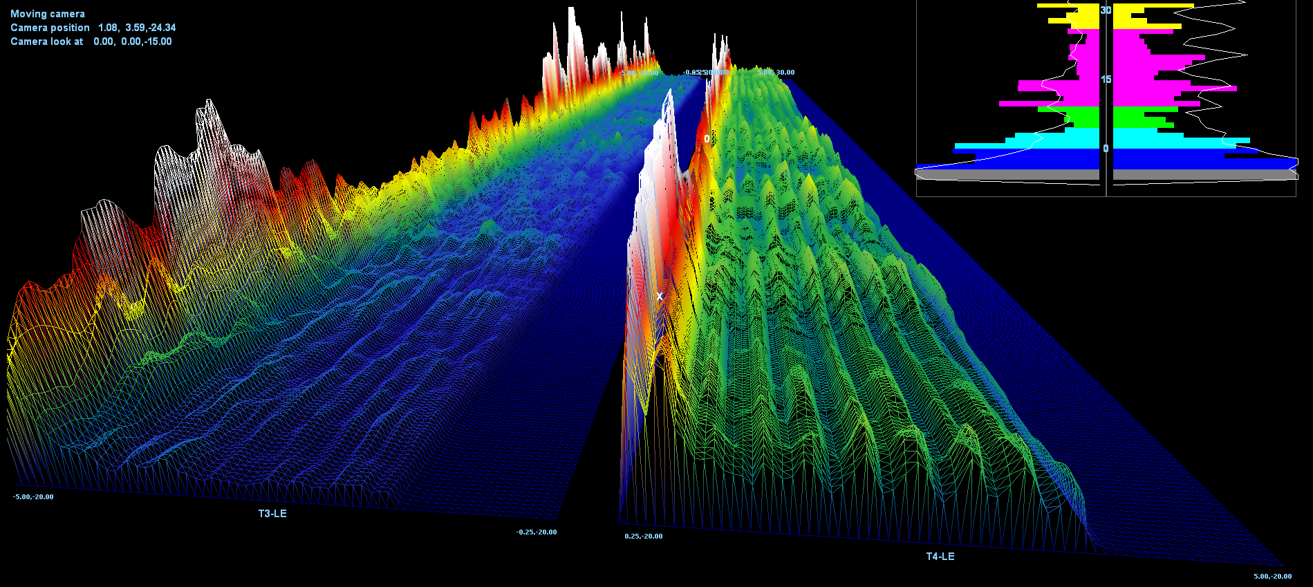 Na imagem acima o EEG da mesma criança das imagens anteriores, mas 15 dias após a primeira sessão. Novamente três pontos devem ser ressaltados: 1) o equilíbrio entre os hemisférios é muito maior, 2) as ondas de alta frequência (barras verdes, rosas e amarelas) se reduziram e 3) as ondas Alpha (barras horizontais em azul claro) já estão superando as ondas theta (barras em azul escuro), tornando a criança disponível para receber informações e aprendizados do mundo exterior.