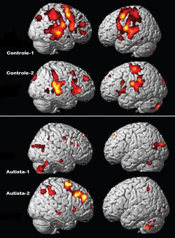 Ao lado vemos a imagem de um experimento mostrando a ativação coordenada em vários centros cerebrais (particularmente nas áreas frontais e temporais) em duas pessoas fora do espectro autista (parte superior da imagem) enquanto em duas crianças autistas (parte inferior) não há a integração destes centros. A maior atividade no cerebelo das crianças autistas é entendida como uma resposta compensatória que, no entanto, adiciona uma nova disfunção e estresse ao cérebro.