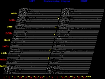 Para Bárbara isso levou dois dias. O gráfico ao lado representa o que chamamos de Alpha Test: a capacidade da pessoa: (1) entrar em Alpha (logo após o número amarelo 1 que está entre os dois hemisférios), (2) relaxar ainda mais e entrar em Theta (ondas de 3Hz entre 35 segundos e 1min), (3) ser forçada a entrar em Beta por estímulo externo e (4) voltar imediatamente para Alpha e se manter assim. O controle das ondas cerebrais apresentado neste gráfico fala por si mesmo. Basta compará-