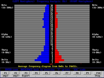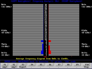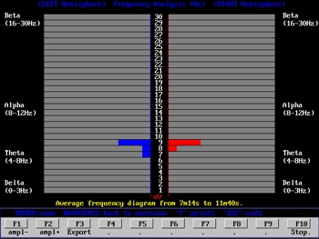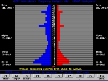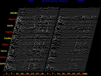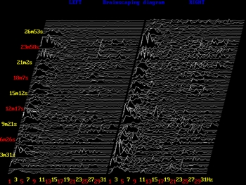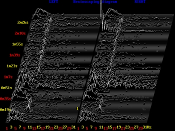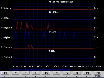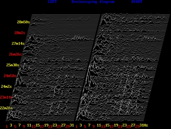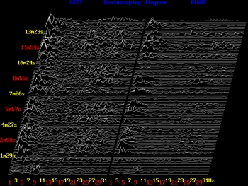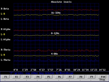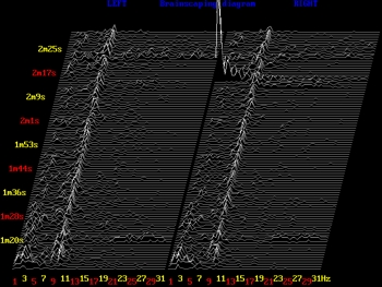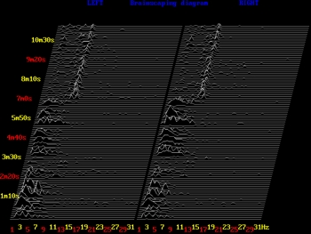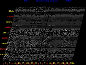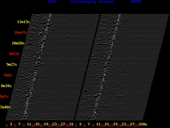 Com o estímulo anterior do Brainwave os danos cerebrais existentes estão desaparecendo na mesma proporção em que desaparecem as ondas acima dos 14Hz (na realidade elas estão presentes aqui por conta do estímulo externo oferecido à Bárbara em torno do 1° minuto). Este estímulo é uma das maneiras de treinar a habilidade plástica do cérebro de saltar de uma onda para outra por vontade própria e também por reação ao ambiente em qualquer circunstância de ameaça.