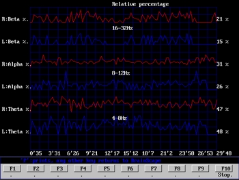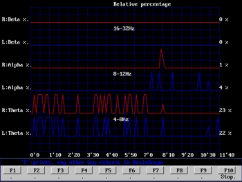 As percentagens relativas da mesma leitura anterior. O hemisfério esquerdo (linhas azuis) aprendendo a funcionar em todas as ondas sem esperar muito pelo direito. Ainda estamos no segundo dia de curso.