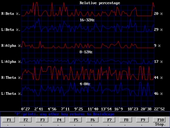 A oscilação destas linhas é a representação gráfica das ondas cerebrais em suas percentagens relativas.
