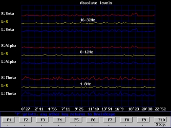 O primeiro par de linhas (acima) mede exclusivamente as ondas Beta. O par central mede as ondas Alpha e o último as ondas Theta.